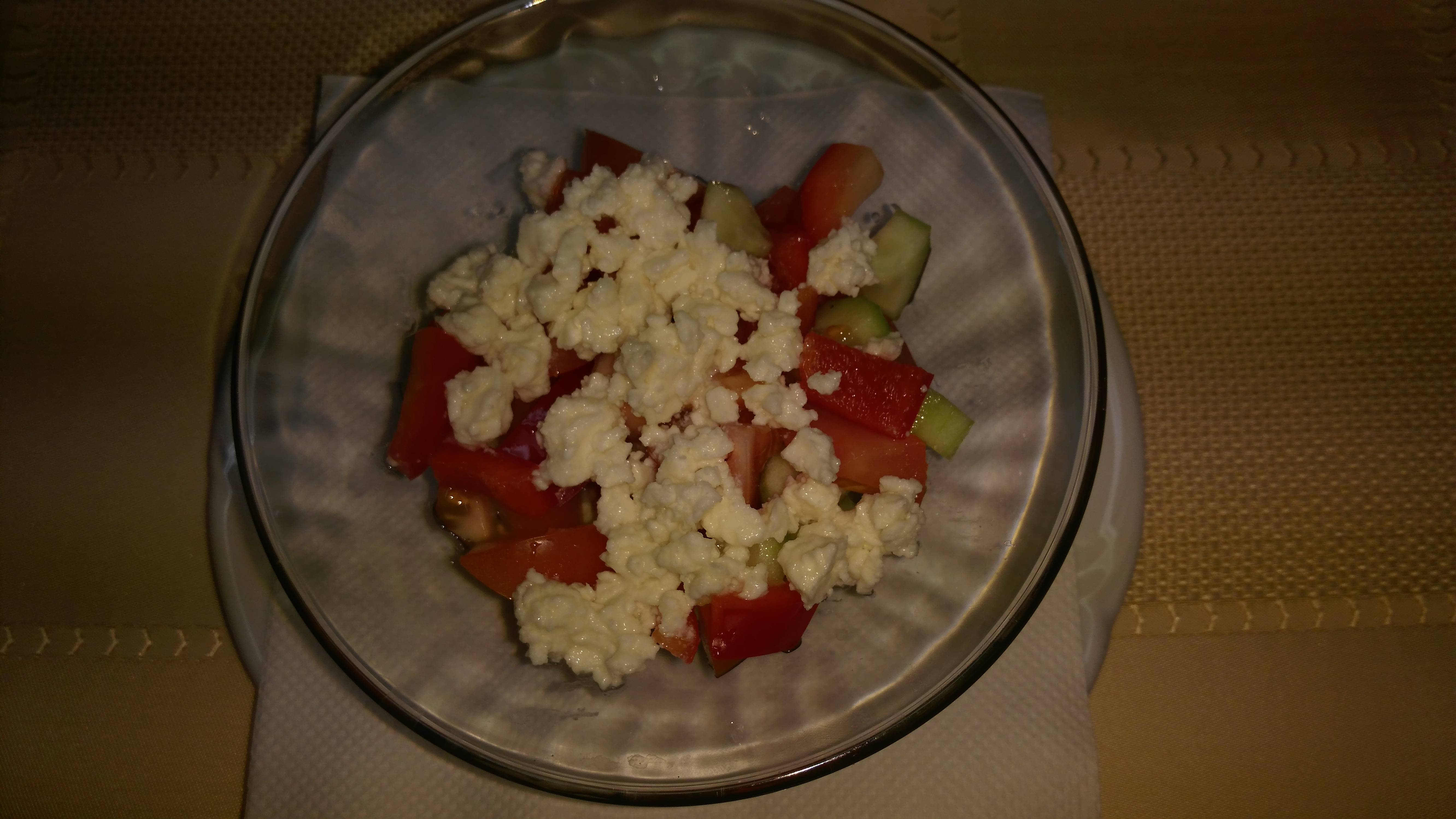 40 g okurka, 40 g paprika, 40 g rajče, 30 g balkánský sýr, sladkokyselá octová zálivka