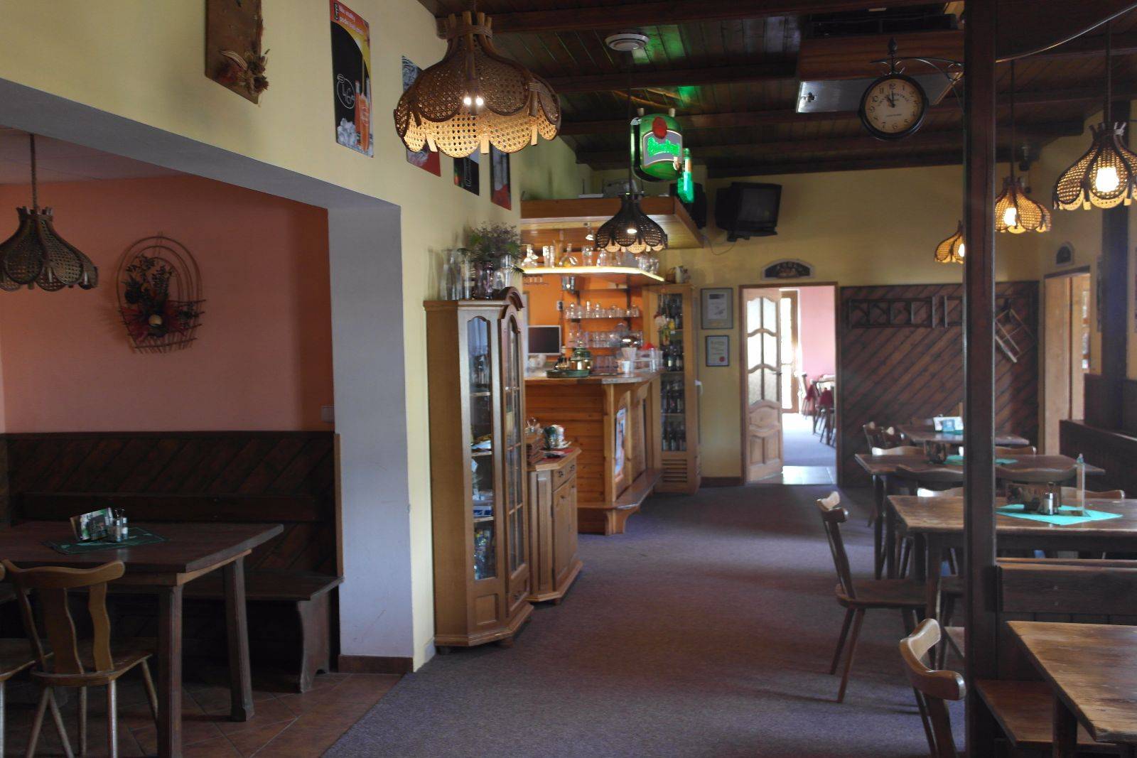 Bar s restauracíRestaurace je otevřena pro veřejnost od 9.00 do 22.00 každý den. Pro ubytované hosty je již otevřeno od 8.00 hod. Platba je možná hotově nebo kartou. Pořádáme svatby, promoce, rodinné a školní srazy, firemní večírky a školení. Kapacita míst na restauraci je pro 60 osob a v jídelně pro 60 osob.